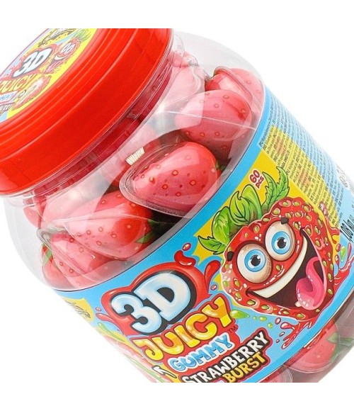 Caramelle gommose a forma di FRAGOLA 3D con ripieno liquido. Caramelle gommose a forma di fragola 3D con ripieno liquido. Con il loro aspetto unico, il gusto di fragola e la consistenza inconfondibile le Juicy Strawberry 3D sono delle deliziose caramelle ripiene di una golosa gelatina alla fragola con un tocco inastettatamente sour che richiama il sapore fresco, acido e naturale del frutto.